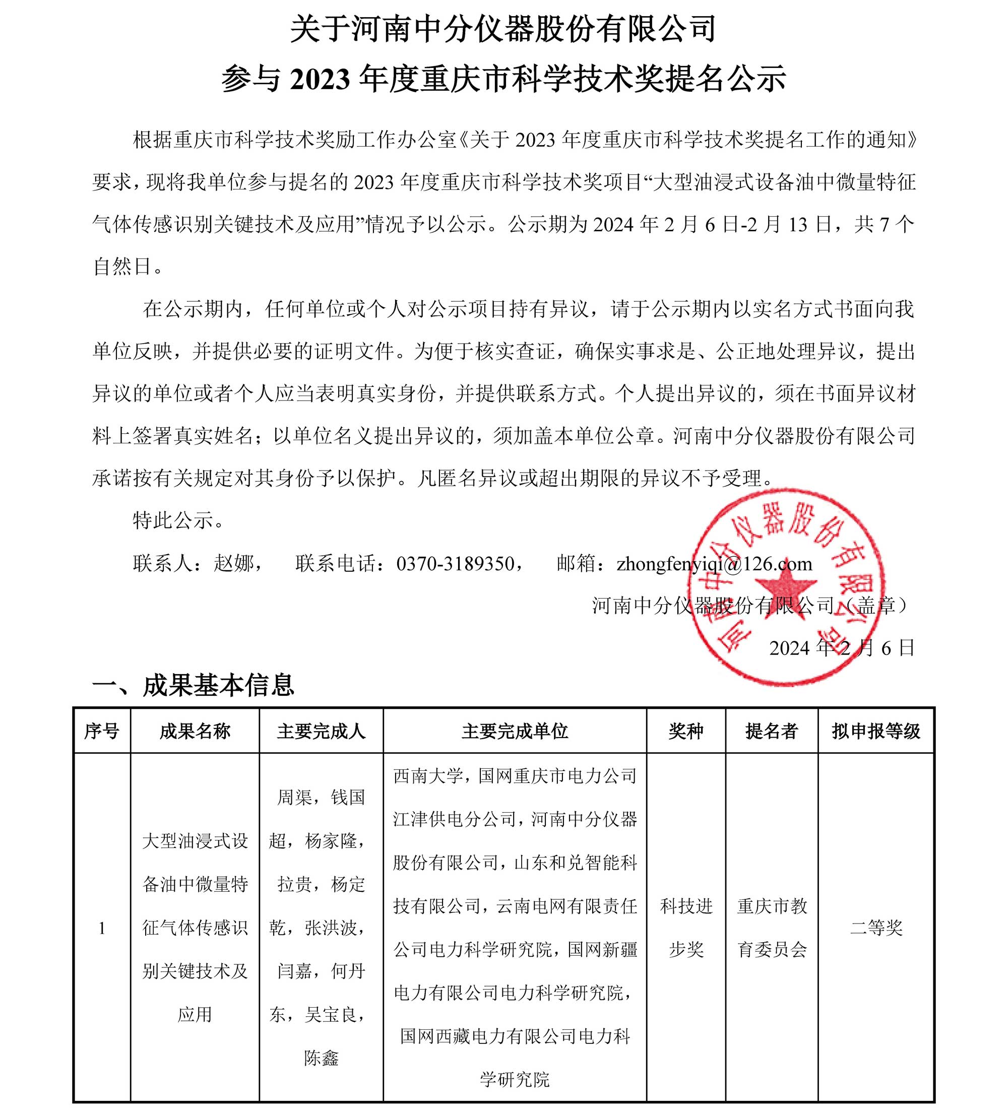 關于河南中分儀器股份有限公司參與2023年度重慶市科學技術獎提名公示