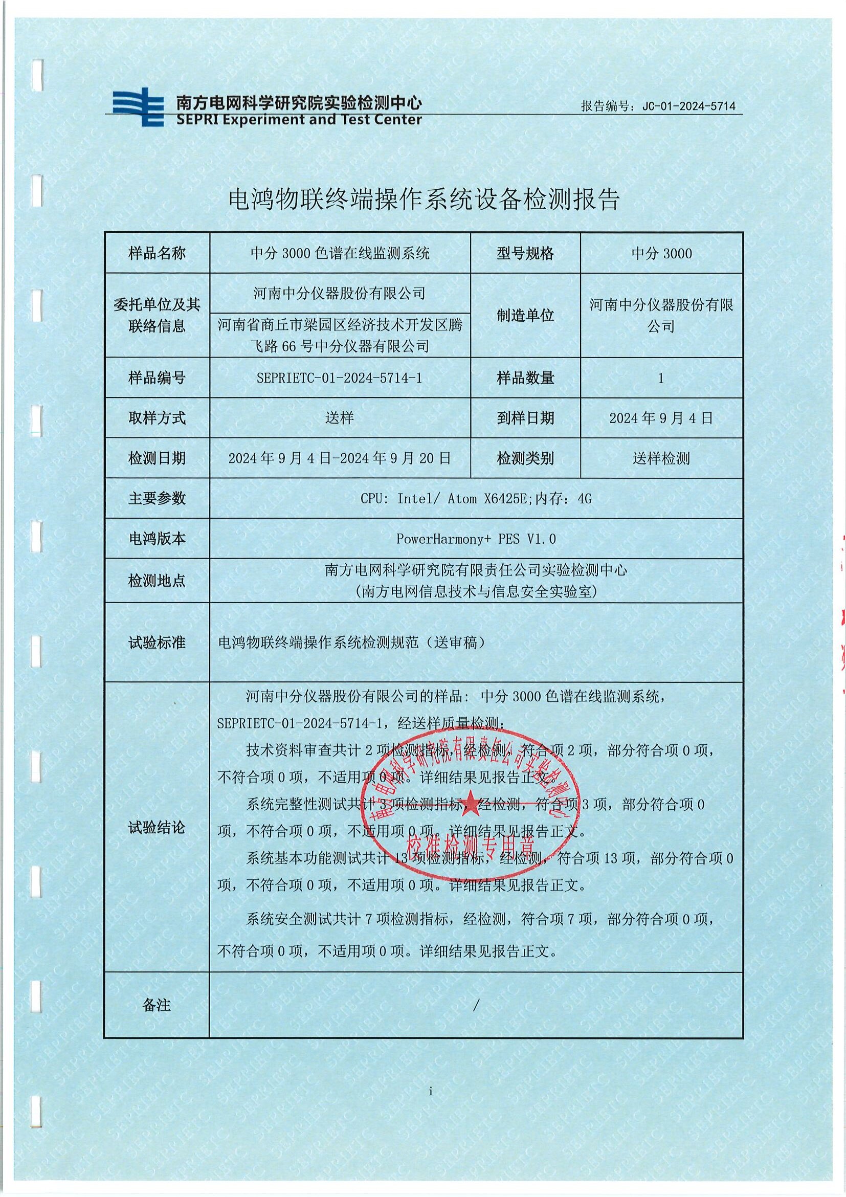 近期中分3000色譜在線監(jiān)測系統(tǒng)新開發(fā)應(yīng)用程序,開啟了色譜在線監(jiān)測產(chǎn)品適配電鴻操作系統(tǒng)實現(xiàn)萬物互聯(lián)新征程。24年9月份順利取得了南方電網(wǎng)科學(xué)研究院實驗檢測中心的檢測報告,色譜在線監(jiān)測產(chǎn)品國產(chǎn)操作系統(tǒng)兼容性不斷提升,為行業(yè)的發(fā)展注入了新的活力。此次中分 3000 與電鴻操作系統(tǒng)的適配成功,為電力行業(yè)擺脫對國外操作系統(tǒng)的依賴,建立自主可控技術(shù)體系提供了有力的示范。