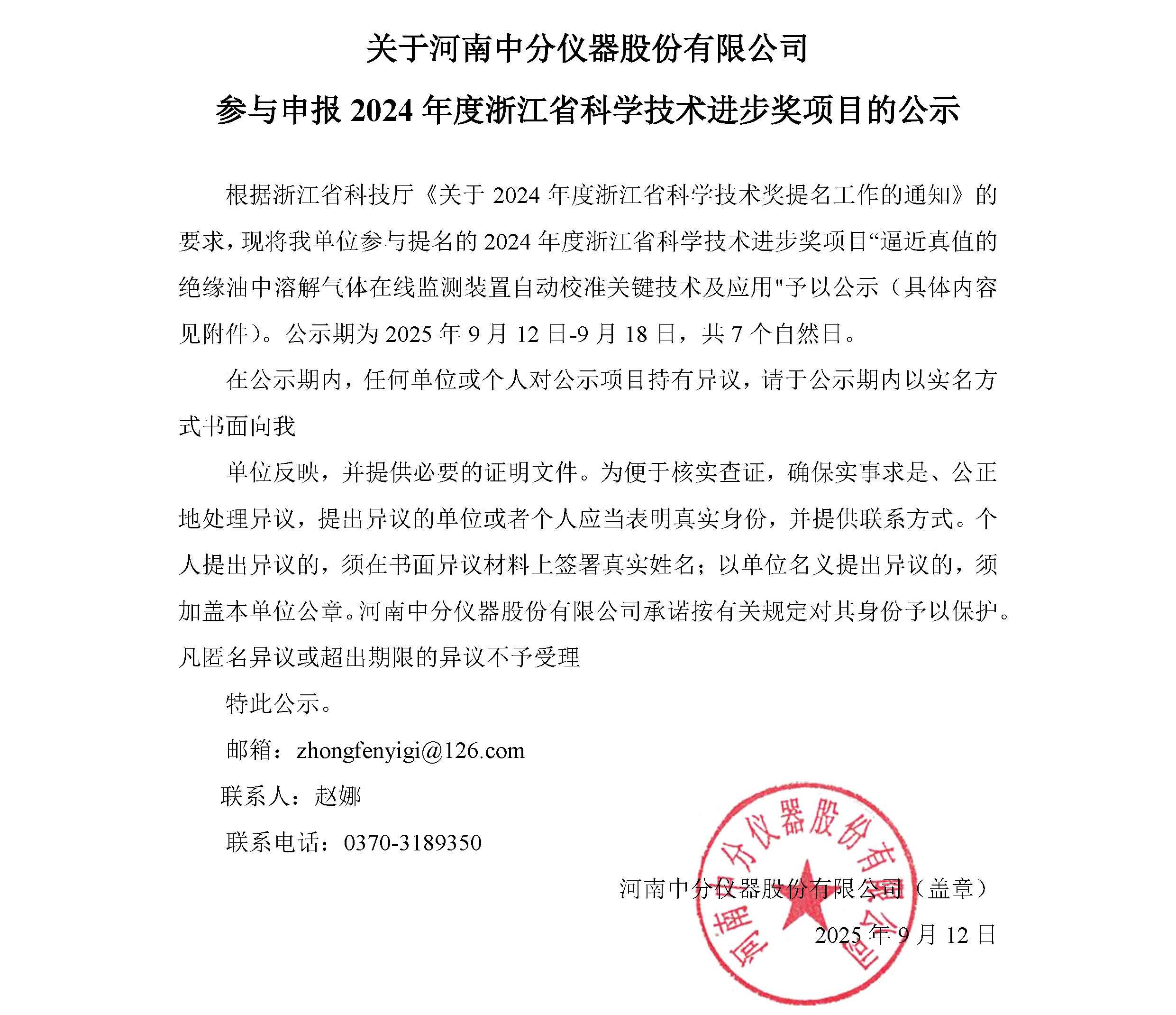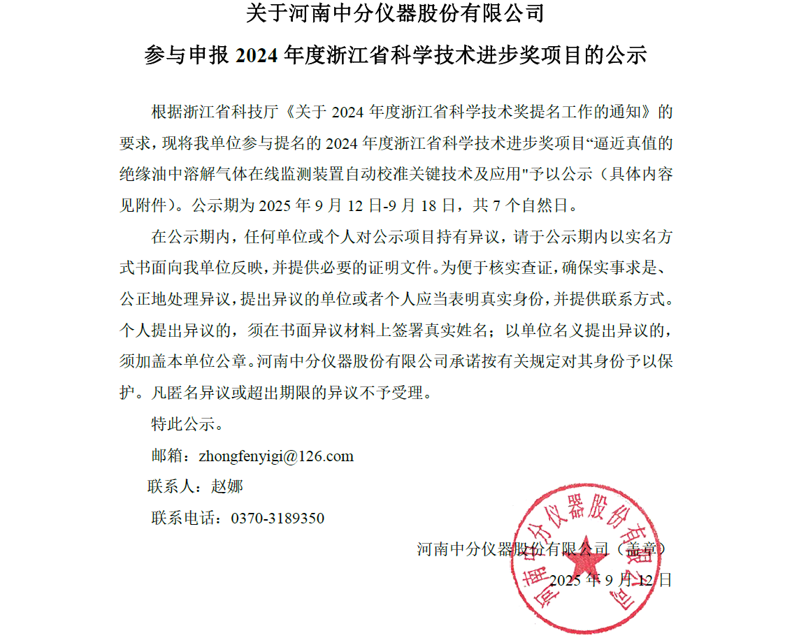 關于河南中分儀器股份有限公司參與申報2024年度浙江省科學技術進步獎項目的公示